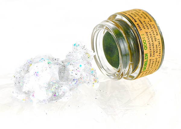 a dark green (transparent-ish) gold moisturizing shimmer makeup gloss balm goo for eye lids, lips + cheeks. squishy in texture.