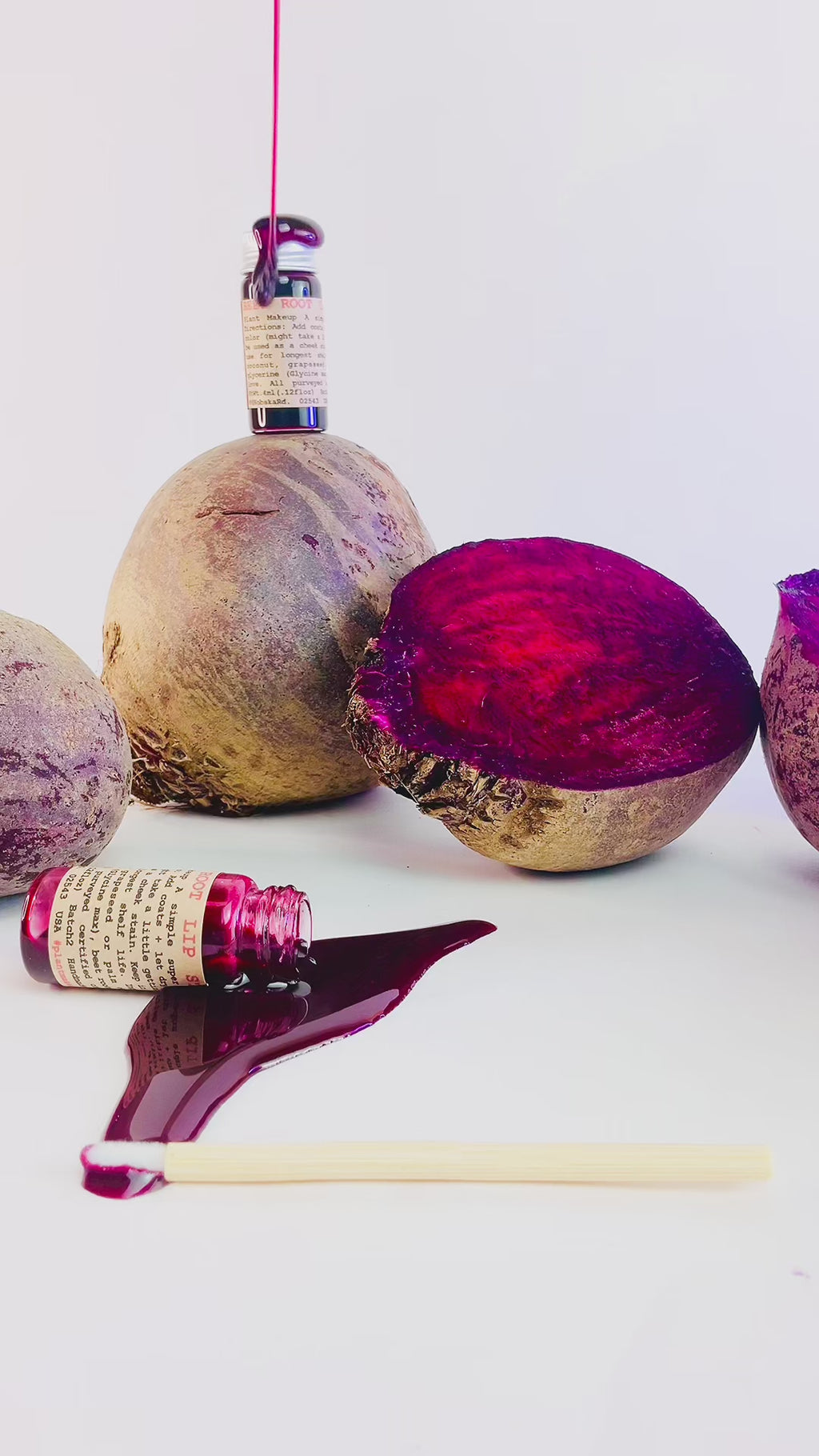 Directions: Add coats and let dry in between for more color. Can be experimented with to be used as a cheek stain. Has a fun sweet veggie taste from the two ingredients. Beet Root Lip Stain is more on the glossy/liquid side in application (best to have an open mind about plant based makeup). It leaves a glossy slightly red tinted lip. It's OK if you eat it by accident! Store in fridge for longest shelf life. Have fun and get ready to fall in love.