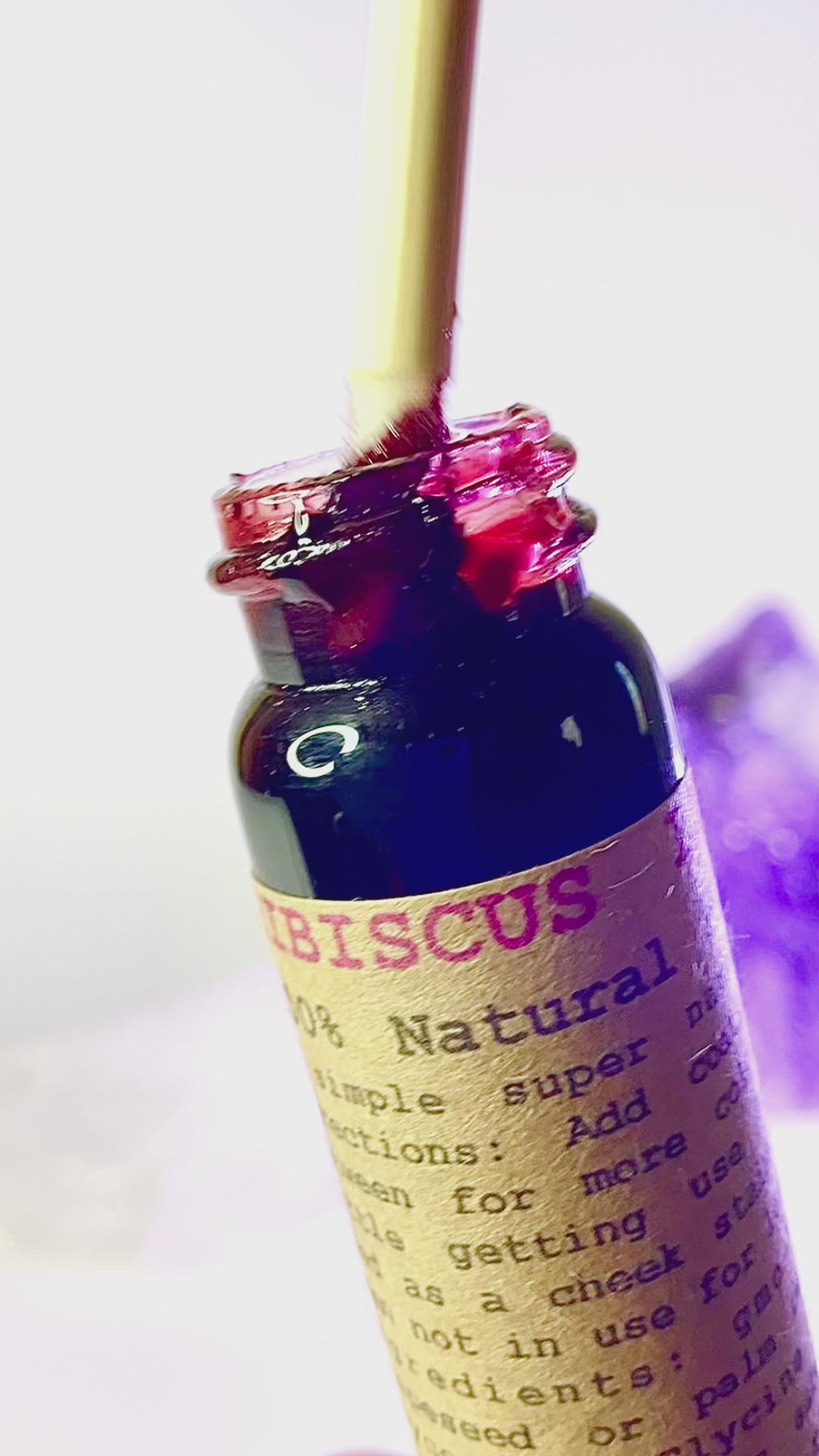 Directions: Add coats and let dry in between for more color. Can be experimented with to be used as a cheek stain. Has a fun sweet tart taste from the two ingredients. Hibiscus Lip Stain is more on the glossy/liquid side in application (best to have an open mind about plant based makeup). It leaves a glossy slightly purple tinted lip. It's OK if you eat it by accident! Store in fridge for longest shelf life. For sensitive skin, try a tiny bit at first to see if skin agrees with formulation. Have fun and get ready to fall in love.
