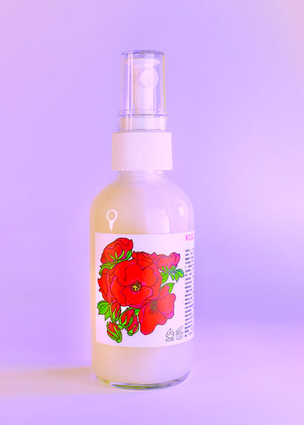 Includes: a 4oz (118ml) size reusable glass bottle with a foaming pump dispenser of Wild Rose Face Wash. Shipped + packaged with love and nature friendliness.